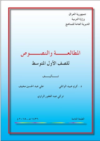 يتناول الكتاب الموجه للصف الأول المتوسط في العراق موضوعات تهدف إلى تطوير المناهج الدراسية وتعزيز القيم الإنسانية والوطنية. يركز على أهمية القراءة والنصوص الأدبية في بناء الهوية الثقافية والإنسانية للطلاب، ويشجع على تنمية مهارات التفكير النقدي والتعبير. كما يبرز دور التعليم في تعزيز التسامح والتعايش السلمي بين أفراد المجتمع.