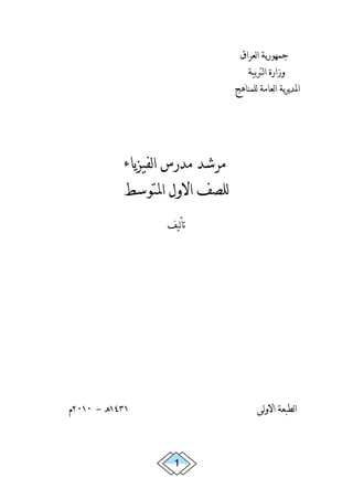 تتناول الوثيقة دليل تدريس مادة الفيزياء للصف الأول المتوسط في العراق، حيث توضح الأهداف التعليمية والمحتوى المطلوب لتدريس المادة. تركز على أهمية تطوير مهارات الطلاب في التفكير العلمي وتهيئتهم لمواجهة التحديات العلمية. يشمل الدليل إرشادات للمعلمين حول كيفية تقديم الدروس بطرق فعالة تسهل الفهم والتعلم.