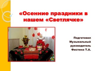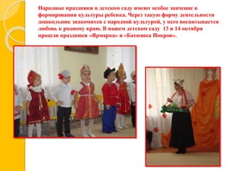 В детском саду «Светлячок» 13 и 14 октября прошли осенние праздники «Ярмарка» и «Батюшка Покров», подготовленные музыкальным руководителем. Дети знакомились с русской народной культурой через танцы и хороводы, а также узнали о национальной одежде и народных инструментах. Праздники сыграли важную роль в формировании любви к родному краю у дошкольников.