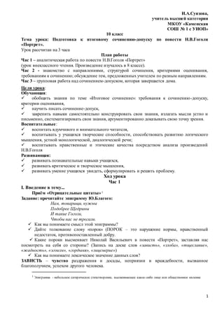 Документ представляет план урока для 10 класса по подготовке к итоговому сочинению по повести Н.В. Гоголя 'Портрет'. Урок состоит из трёх частей: аналитическая работа, знакомство с критериями и структурой сочинения, а также групповая работа. Основная цель урока - научить учащихся писать сочинение-допуск, развивая их творческие, аналитические и нравственные качества.