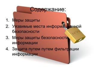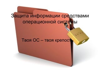 Документ рассматривает защиту информации средствами операционной системы, определяя цели и объекты исследования, а также уровни и меры защиты информации. Основное внимание уделяется уязвимым местам информационной безопасности и важности контроля доступа, восстановления и обнаружения инцидентов. Разработан план учебного проекта для учащихся, направленный на противодействие взлому операционных систем.
