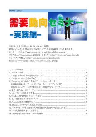 月 25 日(火) 18:30~20:30(2 時間) 経営コンサルタント 竹内幸次 株式会社スプラム代表取締役 中小企業診断士 ホームページ:http://www.spram.co.jp e-mail:takeuchi@spram.co.jp ブログ:http://blog.goo.ne.jp/2300062 ツイッター:http://twitter.com/spram_takeuchi フェイスブック(個人):http://www.facebook.com/spramtakeuchi Facebook ページ(企業):http://www.facebook.com/spramjp 1.トレンド情報源........................................................................................................... 1 2.ヒット商品番付........................................................................................................... 2 3.Google アラートによる情報のクリッピング ....................................................................... 2 4.Google トレンドの分析を深める .................................................................................... 3 5.Google トレンドから得た情報をプロモーションに活かす ................................................... 4 (1)検索が多いキーワードを使ってホームページやブログを書く........................................ 4 (2)ポスティングサービスで興味が高い地域にアプローチする........................................... 4 6.業者を頼らない SEO のステップ................................................................................... 5 7.インバウンド市場を分析する........................................................................................ 6 8.YouTube 閲覧情報からのニーズ察知 ........................................................................... 9 9.ネット購買者が買うまでのステップ ...............................................................................10 10.Youtube 動画の離脱ポイント.....................................................................................10 11.RESAS/リーサスから地域経済を知る ........................................................................11 12.アルバイト・パート募集時平均時給調査から最適な時給を設定する ................................11 13.「不満」情報を入手して改善する................................................................................13 14.湘南地域の経済・経営ニュースを得る ........................................................................13
