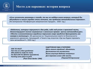 Документ обсуждает исторические аспекты и современные проблемы, связанные с парковкой в городах, включая статистику спроса и предложения парковочных мест. Рассматриваются различные предложения по решению парковочных проблем, а также влияние тарифов на парковку на потребительское поведение автомобилистов. Способы регулирования парковочного пространства и планировочные подходы также освещены.