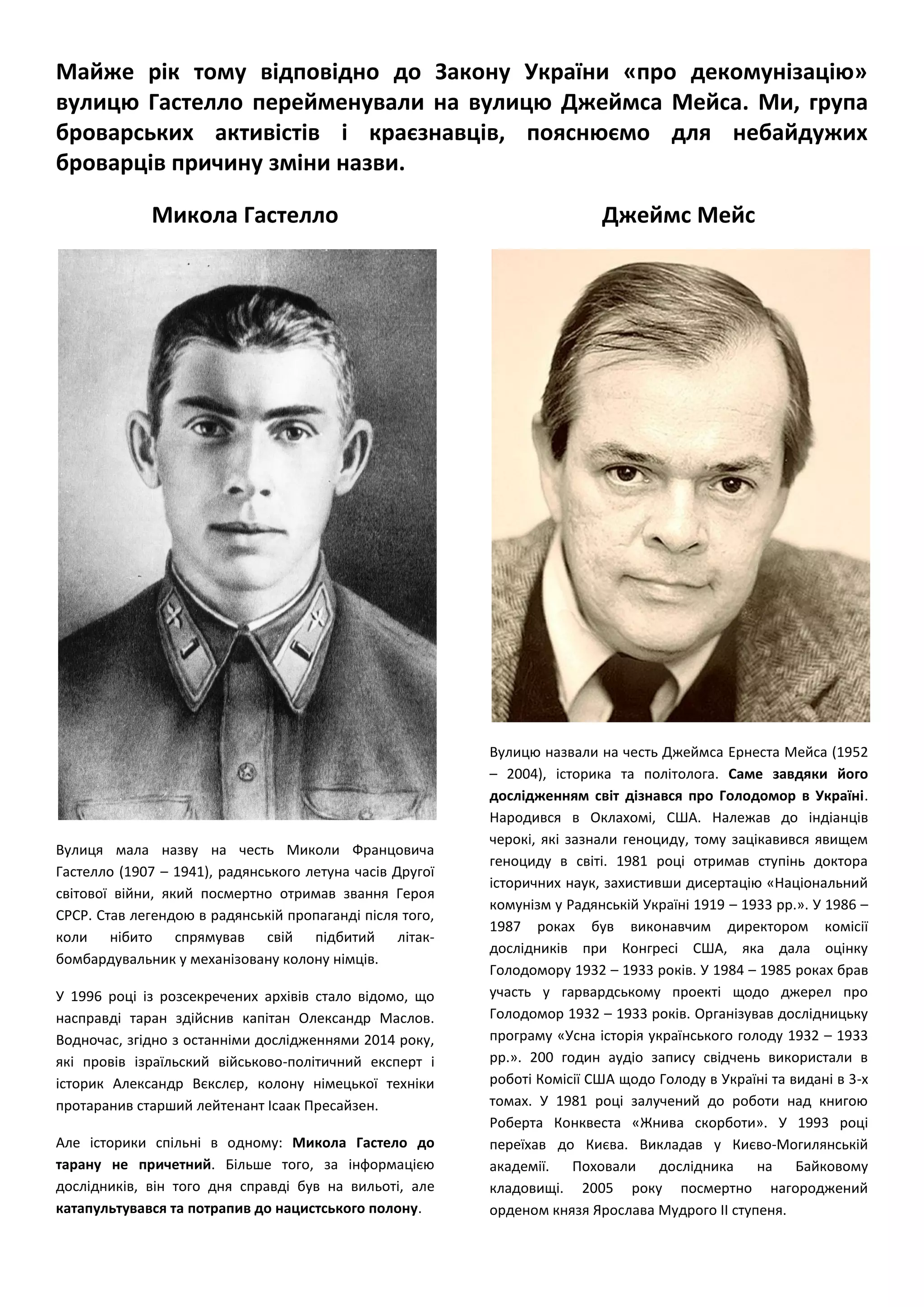 25 грудня 2015 року в рамках декомунізації в Броварях перейменували вулицю Гастелло на вулицю Джеймса Мейса.