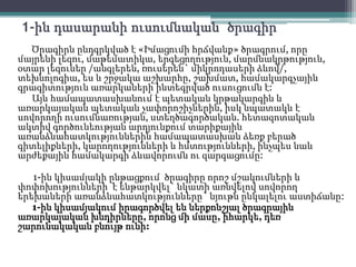 1-ին դասարանի ուսումնական ծրագիրԾրագիրն ընդգրկված է «Իմացումի հրճվանք» ծրագրում, որը մայրենի լեզու, մաթեմատիկա, երգեցողություն, մարմնակրթություն, օտար լեզուներ /անգլերեն, ռուսերեն`միկրոդասերիձևով/, տեխնոլոգիա, ես և շրջակա աշխարհը, շախմատ, համակարգչային գրագիտություն առարկաների ինտեգրված ուսուցումն է: Այնհամապատասխանումէ պետական կրթակարգին և առարկայական պետական չափորոշիչներին,իսկնպատակն է սովորողի ուսումնառության, ստեղծագործական.հետազոտական ակտիվ գործունեության արդյունքում տարիքային առանձնահատկություններին համապատասխան ձեռք բերած գիտելիքների, կարողությունների և հմտությունների, ինչպես նաև արժեքային համակարգի ձևավորումն ու զարգացումը:1-ին կիսամյակի ընթացքում ծրագիրը որոշմշակումներիև փոփոխությունների էենթարկվել` նկատի առնվելով սովորող երեխաների առանձնահատկությունները` նյութն ընկալելու աստիճանը: 1-ին կիսամյակումիրագործվել են ներքոնշյալ ծրագրային առարկայական խնդիրները, որոնց մի մասը, իհարկե, դեռ շարունակական բնույթ ունի: