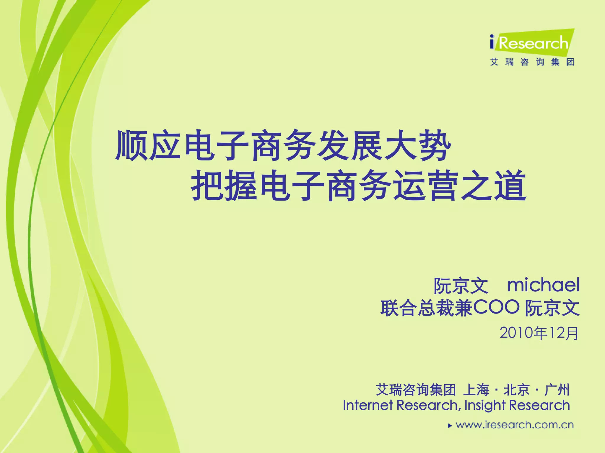 电子商务在中国快速发展,2010年市场交易规模达到1.2万亿元,预计未来几年将继续增长。国内电子商务融资活跃,传统企业开始重视在线销售渠道,消费者网购接受度逐步提升。整体市场向平台化和生态系统优化方向发展,未来将呈现欧美亚三足鼎立的格局。