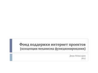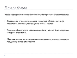 Документ описывает концепцию функционирования фонда поддержки интернет-проектов, целью которого является поддержка инновационных идей в области интернет технологий в России. Фонд предоставляет финансовую и управленческую помощь проектам, направленным на решение общественно значимых проблем, и рассматривает заявки на финансирование, основываясь на четко определённых бизнес-кейсах. Кроме того, документ обсуждает проект кругосветного полета, его экономические показатели, риски и подходы к управлению проектом.