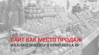 Документ обсуждает роль сайта в интернет-маркетинге, подчеркивая его значение как места продаж и применения концепции 4P (продукт, место, цена, продвижение). Также рассматриваются принципы восприятия и визуализации, которые могут быть использованы для эффективного дизайна сайта. В заключение, дается совет рассматривать сайт как пространство, чтобы правильно организовать контент и функции.