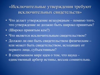 Документ исследует сложные вопросы о природе сознания, включая достоверность свидетельств и взаимосвязь ума и мозга. В нем приведены мнения как сторонников различных теорий сознания, так и скептиков, подчеркивающих недостаток эмпирических данных. Также обсуждаются потенциальные исследования, которые могут помочь в понимании этих тем с использованием как научных, так и контемплативных методов.