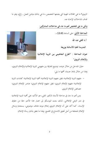 تقرير مفصل حول يوم دراسي حول الإعلام، حيث تم استضافة عدد من الأساتذة والضيوف لتبادل الأفكار حول مفهوم الإعلام وأثره. تمت مناقشة العديد من المواضيع المتعلقة بالإعلام واستراتيجيات التعليم ووسائل التواصل، مع تقديم مداخلات من مختصين في هذا المجال. الهدف من الاجتماع هو إلقاء الضوء على أهمية الإعلام في تحقيق التطوير الاجتماعي والتعليمي.