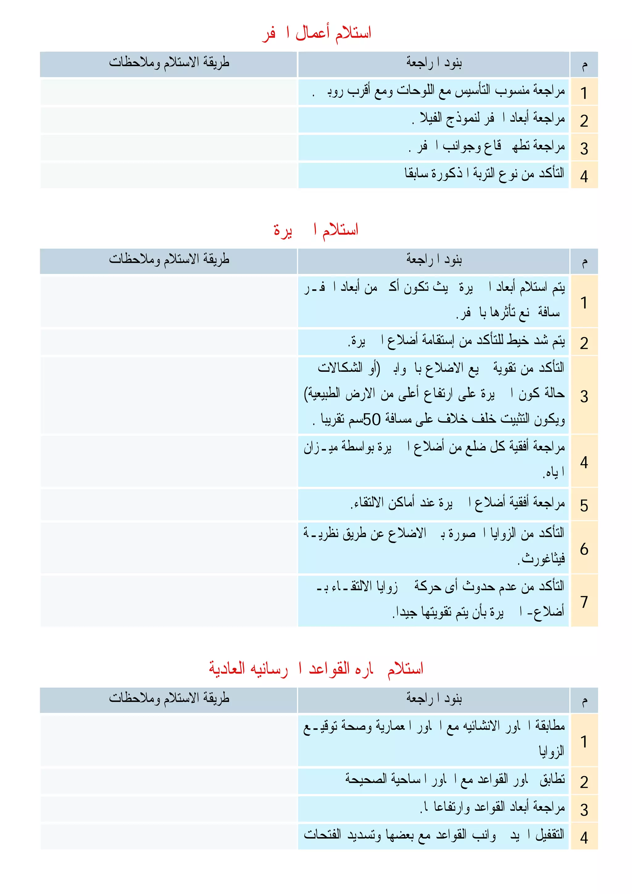 ﺑﻨﻮﺩﺍﻻﺳﺘﻼﻡ ﻃﺮﻳﻘﺔﻭﻣﻼﺣﻈﺎﺕ 1ﺍﻟﻘﻮﺍﺋﻢ ﻣﺮﺍﺟﻌﺔ)ﺍﻟﻌﺮﻭﻕ(ﺑﻴﻨﻬﺎ ﻭﺍﳌﺴﺎﻓﺎﺕ. 2 ﺣﺎﻟـﺔ ﰱ ﺑﻌـﻀﻬﺎ ﻣـﻊ ﺍﻟﻌـﺮﻭﻕ ﻭﺻﻞ ﺃﻣﺎﻛﻦ ﻣﺮﺍﺟﻌﺔ ﺍﻟﻮ ﻋﻨﺪ ﺍﻟﺘﻘﻮﻳﺔ ﻣﺘﺎﻧﺔ ﻣﻦ ﻭﺍﻟﺘﺄﻛﺪ ﺍﻟﻌﺎﻟﻴﺔ ﺍﻻﺭﺗﻔﺎﻋﺎﺕﺻﻼﺕ. 3ﺍﻟﺴﻘﻒ ﻭﺑﻼﻃﺔ ﺍﻟﻜﻤﺮﺍﺕ ﻋﺮﻗﺎﺕ ﺗﺜﺒﻴﺖ ﺟﻮﺩﺓ ﻣﺮﺍﺟﻌﺔ. 4 ﻣﺎﺋﻠـﺔ ﺑﻌـﺮﻭﻕ ﺍﻟﺸﺪﺓ ﺗﻘﻮﻳﺎﺕ ﻋﻤﻞ ﻣﺮﺍﺟﻌﺔ)ـﺎﻳﺰ(ﰱ ﻭﻣـﻊ ﺍﻟـﺸﺪﺓ ﻋﺮﻭﻕ ﻣﻊ ﺟﻴﺪﺍ ﺑﺎﻟﻘﻤﻂ ﻭﺗﺜﺒﻴﺘﻬﺎ ﺍﻻﲡﺎﻫﲔ ﺍﳌﺼﺒﻮﺑﺔ ﺍﳊﻮﺍﺋﻂ ﺃﻭ ﺍﻻﻋﻤﺪﺓ. 5 ﺑﻌﺮﻭﻕ ﺍﻟﻜﻤﺮﺍﺕ ﻗﺎﻉ ﺗﻘﻮﻳﺔ ﻣﺮﺍﺟﻌﺔ)ﺣـﺒﺲ(ﺑﺎﺳـﺘﺨﺪﺍﻡ ﺍﻟﻘﻤﻂ. 6 ﺗﻘﻮ ﻣﺮﺍﺟﻌﺔﲟﺎ ﺍﻟﺘﺴﺪﻳﺪ ﺳﻼﻣﺔ ﻣﻦ ﻭﺍﻟﺘﺄﻛﺪ ﺍﻻﻋﻤﺪﺓ ﺭﻗﺎﺏ ﻳﺔ ﺍﻟﻔﻚ ﺑﻌﺪ ﺧﺮﺳﺎﻧﻴﺔ ﺯﻭﺍﺋﺪ ﻭﺟﻮﺩ ﻋﺪﻡ ﻳﻀﻤﻦ. 7 ﺑﻘﻴـﺔ ﻣـﺴﺘﻮﻯ ﻋﻦ ﺍﳌﻴﺎﻩ ﺩﻭﺭﺍﺕ ﺑﻼﻃﺎﺕ ﺳﻘﻮﻁ ﻣﺮﺍﺟﻌﺔ ﺍﻟﺒﻼﻃﺎﺕ)ﻭﺟﺪ ﺇﻥ.( 8 ﻭﺍﻟﺘﺄﻛﺪ ﺑﺒﻌﻀﻬﺎ ﺍﻟﺘﻄﺒﻴﻖ ﺃﻟﻮﺍﺡ ﺍﺗﺼﺎﻝ ﻋﻨﺪ ﺍﻟﺘﻘﻮﻳﺎﺕ ﻣﺮﺍﺟﻌﺔ ﺳﻠﻴﻤﺔ ﺑﻄﺮﻳﻘﺔ ﺍﻟﻮﺻﻼﺕ ﻋﻤﻞ ﻣﻦ. ﻡﺍﳌﺮﺍﺟﻌﺔ ﺑﻨﻮﺩﺍﻻﺳﺘﻼﻡ ﻃﺮﻳﻘﺔﻭﻣﻼﺣﻈﺎﺕ 1 ﺍﶈـﺎﻭﺭ ﻣـﻊ ﺍﶈـﺎﻭﺭ ﻭﺗﻄـﺎﺑﻖ ﺍﳋﺎﺭﺟﻴﺔ ﺍﻻﺑﻌﺎﺩ ﻣﺮﺍﺟﻌﺔ ﺍﻟﺼﺤﻴﺤﺔ. 2 ﻋﻠـﻰ ﺍﻟﺒﻼﻃـﺎﺕ ﻭﺍﺭﺗﻔﺎﻋـﺎﺕ ﻭﺃﻣﺎﻛﻦ ﻣﻨﺎﺳﻴﺐ ﻣﺮﺍﺟﻌﺔ ﺍﳌﺨﺘﻠﻔﺔ ﺍﳌﺴﺘﻮﻳﺎﺕ. 3ﺍﻟﺴﻘﻒ ﺑﻼﻃﺎﺕ ﺯﻭﺍﻳﺎ ﻭﺻﺤﺔ ﺃﺑﻌﺎﺩ ﻣﺮﺍﺟﻌﺔ. 4 ﻣﻨﺴ ﻣﺮﺍﺟﻌﺔﻣـﻦ ﻭﺍﻟﺘﺄﻛـﺪ ﺍﻟﺮﻭﺑﲑ ﻣﻊ ﺍﻟﺸﺪﺓ ﺳﻄﺢ ﻮﺏ ﺍﻟﺴﻄﺢ ﺑﻄﻨﻴﺔ ﳌﻨﺴﻮﺏ ﻣﻄﺎﺑﻘﺘﻪ. 5ﺍﻟﻜﻤﺮﺍﺕ ﺳﻘﻮﻁ ﻭﺍﺭﺗﻔﺎﻋﺎﺕ ﺃﺑﻌﺎﺩ ﻣﺮﺍﺟﻌﺔ. 6ﺍﻟﻜﻤﺮﺍﺕ ﺟﻮﺍﻧﺐ ﺭﺃﺳﻴﺔ ﻣﺮﺍﺟﻌﺔ. 7 ﻭﲣﺎﻧـﺎﺕ ﻟﻠـﺴﻘﻒ ﺍﳋﺎﺭﺟﻴـﺔ ﺍﳉﻮﺍﻧﺐ ﺍﺭﺗﻔﺎﻉ ﻣﺮﺍﺟﻌﺔ ﺍﻟﺒﻼﻃﺎﺕ.