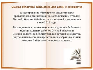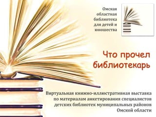 Документ представляет виртуальную выставку Омской областной библиотеки для детей и юношества, основанную на анкетировании библиотекарей о прочитанных ими книгах за месяц. В выставке перечислены произведения, которые читали библиотекари из различных детских библиотек области, включая как известные, так и менее популярные книги. Каждый описывает свою реакцию на прочитанное, что подчеркивает разнообразие интересов и предпочтений среди специалистов в области детского чтения.