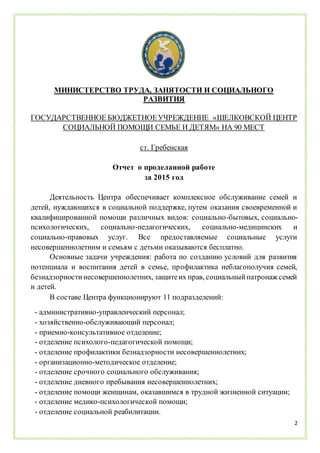 Отчет описывает деятельность государственного бюджетного учреждения "Шелковской центр социальной помощи семье и детям" за 2015 год, включающую комплексное обслуживание семей и детей в трудной жизненной ситуации через предоставление бесплатных социальных, психологических и медицинских услуг. В центре функционирует множество подразделений, и за год им было оказано множество различных услуг, включая 4060 человек, получивших социальные услуги, и реабилитацию 245 несовершеннолетних. Также указывается на развитие материально-технической базы и успешные проекты по социальному обслуживанию и реабилитации детей и семей.