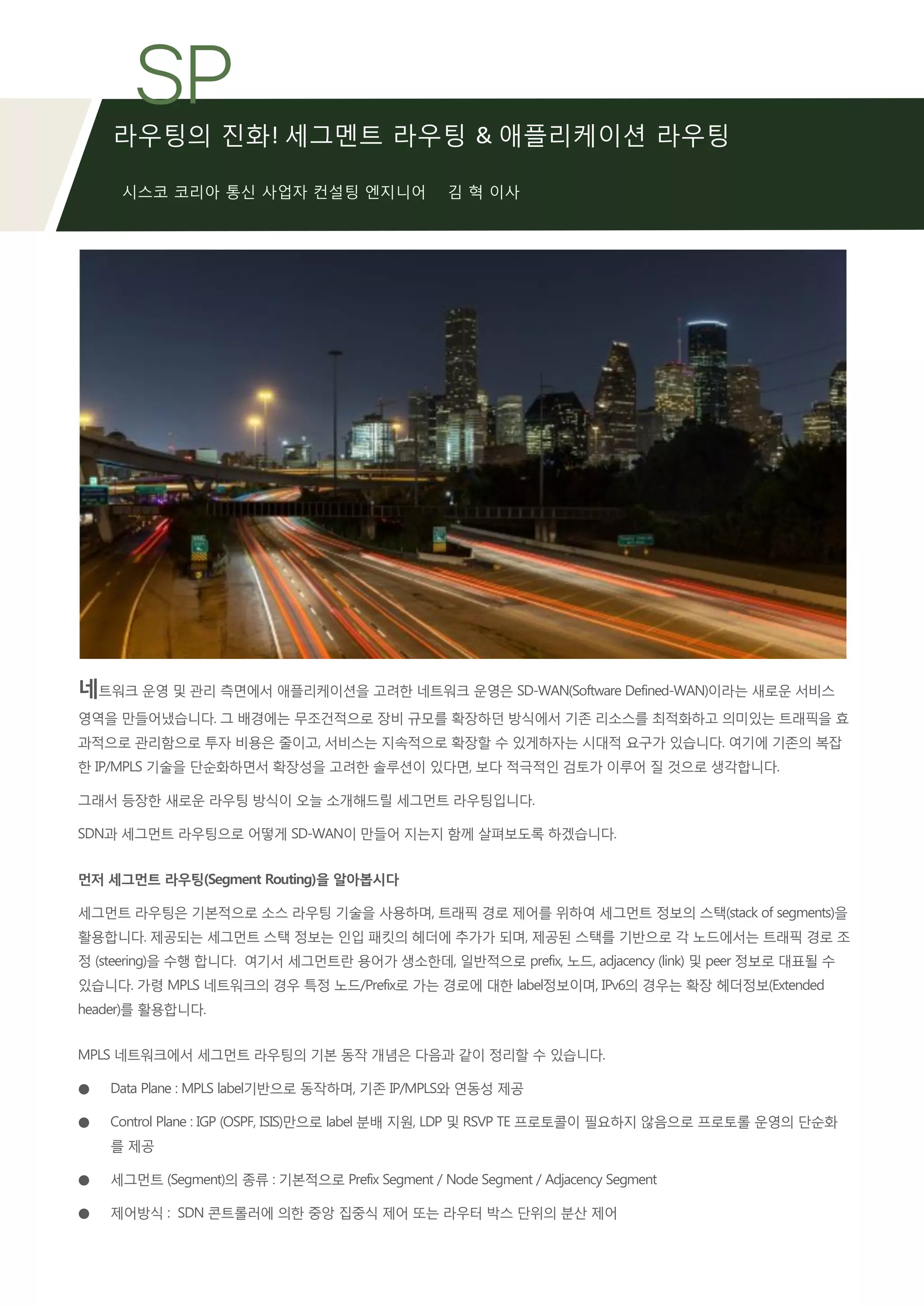 네트워크 운영 및 관리 측면에서 애플리케이션을 고려한 네트워크 운영은 SD-WAN(Software Defined-WAN)이라는 새로운 서비스 영역을 만들어냈습니다. 그 배경에는 무조건적으로 장비 규모를 확장하던 방식에서 기존 리소스를 최적화하고 의미있는 트래픽을 효과적으로 관리함으로 투자 비용은 줄이고, 서비스는 지속적으로 확장할 수 있게하자는 시대적 요구가 있습니다. 여기에 기존의 복잡한 IP/MPLS 기술을 단순화하면서 확장성을 고려한 솔루션이 있다면, 보다 적극적인 검토가 이루어 질 것으로 생각합니다.