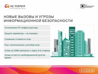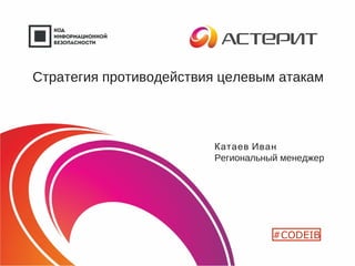 Документ описывает стратегию противодействия целевым атакам, подчеркивая важность новых подходов к защите информационной безопасности в условиях нарастающих угроз. Он рассматривает этапы целевых атак, стоимость утечек данных и модели противодействия, а также представляет решения компании Касперского для защиты от таких атак. В документе приведены данные о киберугрозах и примеры успешного реагирования на атаки.