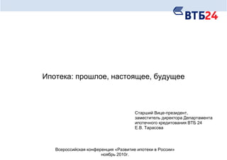 Документ представляет собой отчет о состоянии и перспективах ипотечного рынка в России на основе всероссийской конференции 2010 года, включая анализ динамики задолженности и объемов ипотечных и жилищных кредитов с 2005 по 2010 год. Он также обсуждает уроки кризиса и меры, предпринятые для управления ипотечным бизнесом, включая сертификацию продуктов и стратификации рисков. В заключение, ВТБ 24 активно развивает и адаптирует свои ипотечные предложения в условиях меняющегося рынка.