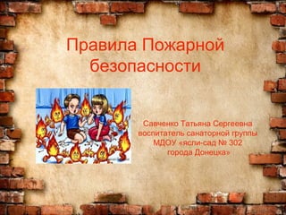 Документ содержит правила пожарной безопасности, разработанные воспитателем Татьяной Сергеевной Савченко для детей санаторной группы. Основная цель - сформировать у детей представления о безопасном поведении с огнем, развивая их речь и память. Воспитательная задача заключается в обучении детей важности осторожности с огнем и спичками.