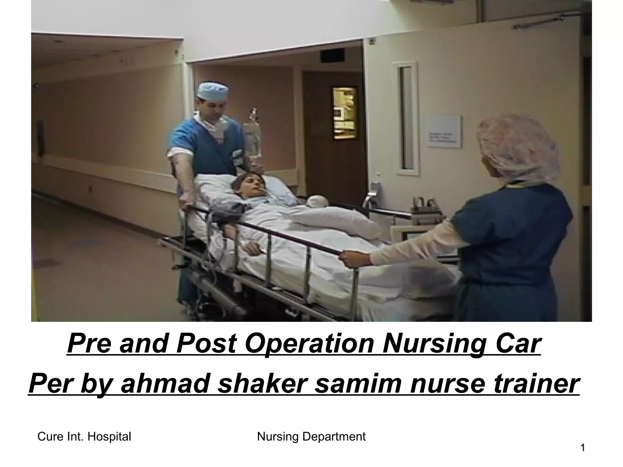 1) The document discusses pre and post-operative nursing care for patients undergoing surgery. It covers topics like pre-operative assessments, informed consent, pre and post-operative teaching, common post-operative problems and their management.