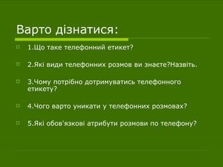 Варто дізнатися: 1.Щотаке телефонний етикет? 2.Які види телефонних розмов ви знаєте?Назвіть. 3.Чому потрібно дотримуватись телефонного етикету? 4.Чого варто уникати у телефонних розмовах? 5.Які обов'язкові атрибути розмови по телефону?