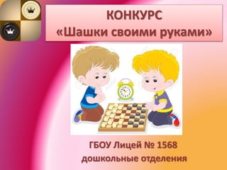Документ описывает конкурс «шашки своими руками», организованный ГБОУ лицей № 1568 для дошкольных отделений № 7 и 8. Конкурс направлен на развитие творческих способностей детей через создание настольной игры. Участники будут иметь возможность продемонстрировать свои навыки и креативность в изготовлении шашек.