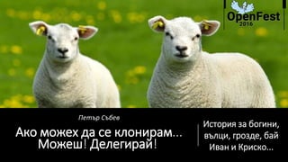 Често всички сме претоварени от задачи. Това важи особено за хората, които ръководят няколко души и често трябва да са на няколко места едновременно или да вършат няколко неща едновременно... Според теорията на управлението понятието „делегиране” означава предаване на задачи и пълномощия на лица, които поемат отговорността за тяхното изпълнение. А с прости думи - да дадеш част от работата да ти я свърши някой друг. Кой точно, коя работа точно, как да я свърши, какво още трябва да дадем заедно със задачата, как да извършим контрола и колко често да искаме обратна връзка - това са все въпроси, на които смятам да отговоря в тази история за богини, вълци, грозде, бай Иван и Криско...