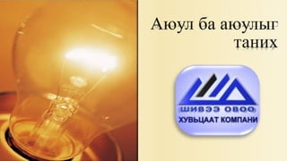 таних чадвар хүн болгонд байдаг уу? ЭНЭ АЮУЛ МӨН ҮҮ??? Ажлын байрны аюул бидний эргэн тойронд, өдөр тутам тохиолдож байдаг. Хаяг: Говьсүмбэр аймаг Шивээговь сум Вэб сайт: www.shivee-ovoo.mn “Шивээ Овоо” ХК Утас: 976- 70546571 Факс: 976-70546464 -Халтирах аюул –Бүдрэх аюул -Өндрөөс унах аюул -Хавчуулах -Хаалттай өрөөнд үлдэх аюул –Цахилгаан тоног төхөөрөмж -Ачаа тээвэрлэлт -Хүчилтөрөгчийн дутагдал -Усанд унах аюул -Дээрээс юм ойчих аюул -Хувийн ба нийтийн хамгаалах хэрэгслийн дутмаг байдал –Анхны тусламж үзүүлэх тогтолцооны дутагдал