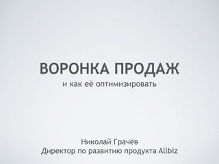 Документ описывает концепцию воронки продаж и методы ее оптимизации, уделяя внимание этапам, аналитике и показателям эффективности. Он предлагает инструменты и план действий для улучшения процесса продаж, включая A/B тестирование, сегментацию пользователей и внедрение CRM-систем. Также рассматриваются проблемы, связанные с неэффективной работой и возможные решения для увеличения прибыли.