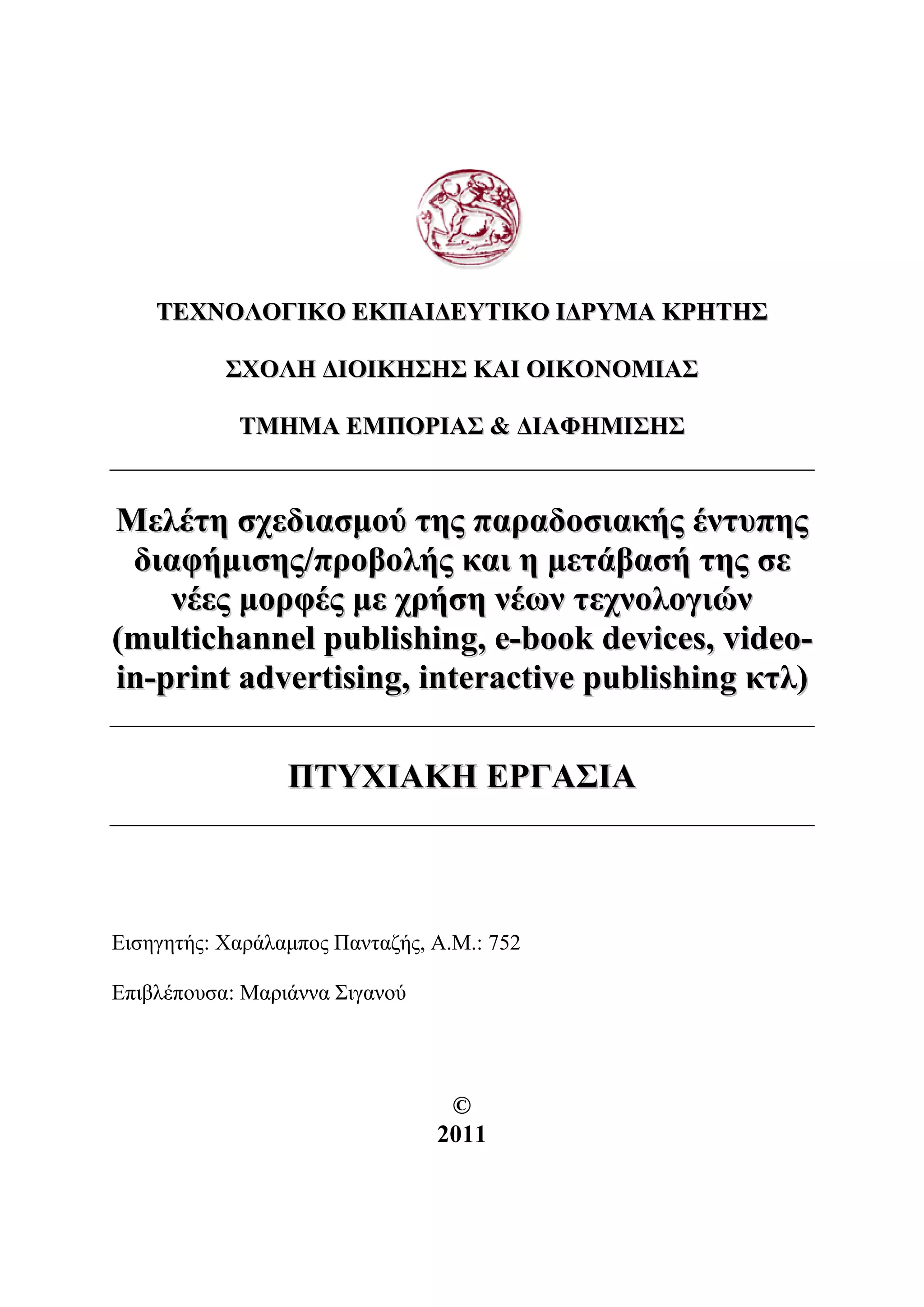 Μελέτη σχεδιασμού της παραδοσιακής έντυπης διαφήμισης/προβολής και η μετάβασή της σε νέες μορφές με χρήση νέων τεχνολογιών ( multichannel publishing, e-book devices, video-in-print, interactive publishing κτλ )