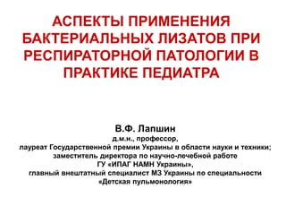 Документ рассматривает применение бактериальных лизатов в лечении респираторных заболеваний у детей, отмечая высокую распространенность острых респираторных инфекций в Украине. Приведены статистические данные о заболеваемости и классификация различных форм бронхитов с учетом возрастных и этиологических факторов. Описывается новый поливалентный механический бактериальный лизат 'Респиброн', показывающий эффективность в профилактике респираторных инфекций.