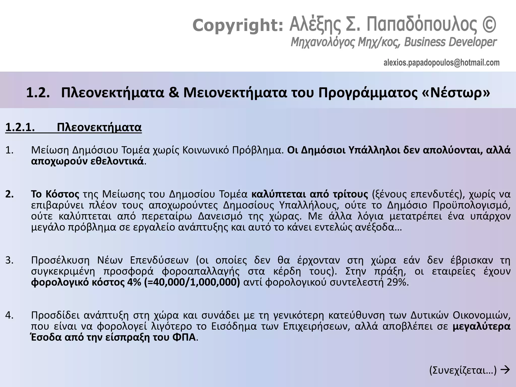 11. Η Ανάπτυξη που φέρνει το Πρόγραμμα «Νέστωρ», δεδομένης μιας προσεκτικής πολιτικής στο
