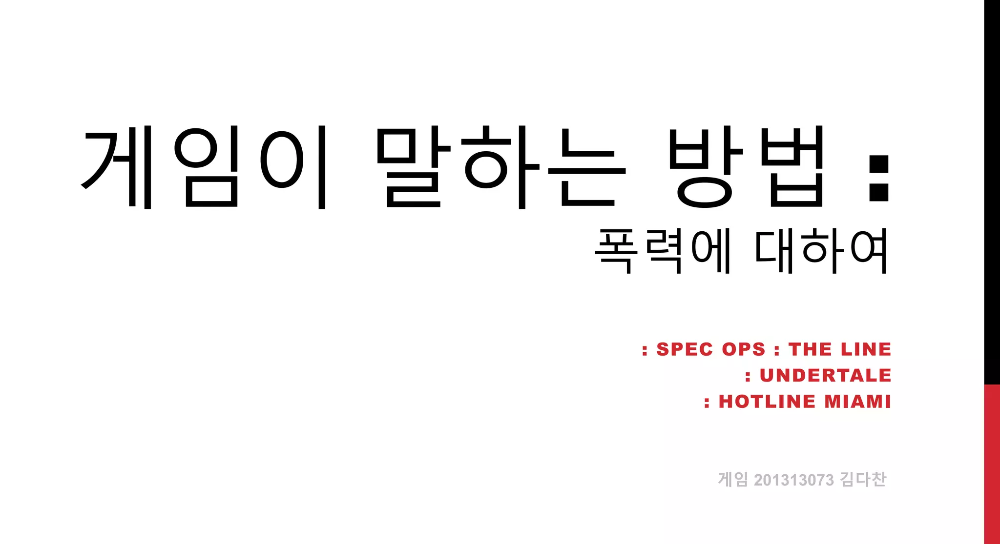 #19 하여 ‘게임만이 가능한 방식’으로 ‘게임의 폭력’에 대해 이야기 한 3개의 게임을 선정하였다. 「스펙옵스 : 더 라인」, 「언더테일」, 「핫라인 마이애미」. 본 문서에서는 상기한 3개의 게임이 ‘게임 속의 폭력’에 대해서 어떻게 이야기 했는지, 그리고 그 이야기 방식 중 어느 것이 제일 좋은 방법인지에 대하여 논한다.