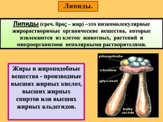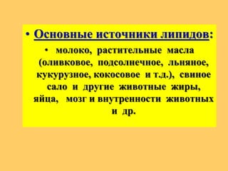 Липиды - это низкомолекулярные жирорастворимые вещества, содержащиеся в животных, растительных и микроорганизмах, играющие важную роль в биологических процессах, включая структуру клеточных мембран и хранение энергии. Они подразделяются на структурные и резервные, имеют множество форм (жиры, воски, фосфолипиды) и выполняют регуляторные функции в организме. Основные источники липидов - молочные продукты, растительные масла и животные жиры, содержащие как насыщенные, так и ненасыщенные жирные кислоты.