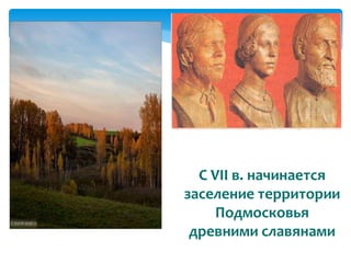 Документ описывает раннюю историю племени вятичей, славян, населявших Подмосковье с VII века. Основными занятиями вятичей были земледелие, охота и скотоводство, что способствовало их оседлому образу жизни и объединению в племенные союзы. В XIII веке христианство начало проникать в этот регион, и с помощью проповедников, таких как Кукша, большинство вятичей приняло православие, несмотря на сопротивление языческих жрецов.
