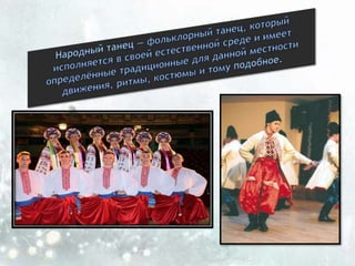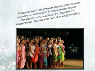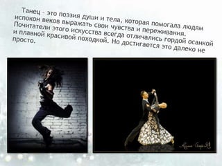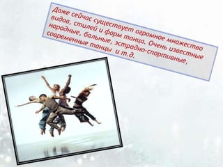 Документ обсуждает происхождение танца и его важность в жизни человека, начиная с первобытных времен. Танец развивался в различных формах, включая классический балет, спортивные и эстрадные танцы, а также восточные танцы, которые становятся всё более популярными. Рассматриваются отличия между стилями, такими как хип-хоп и контемп, подчеркивая разнообразие в танцевальном искусстве.