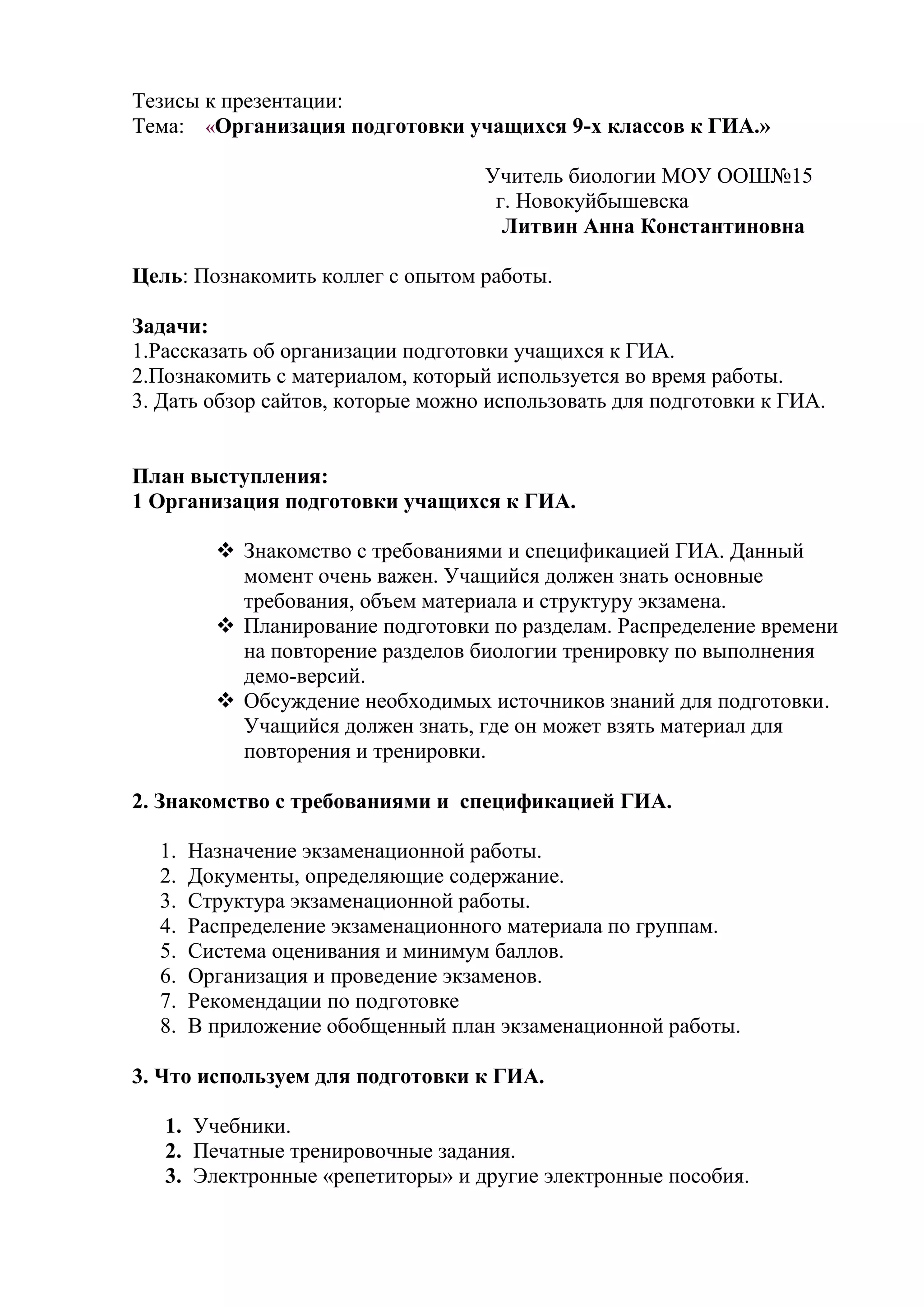 Документ содержит тезисы к презентации о подготовке учащихся 9-х классов к ГИА, которую проводит учитель биологии Анна Константиновна Литвин. Основные цели включают знакомство с требованиями к экзамену, планирование подготовки и использование различных источников и материалов для успешного прохождения ГИА. Также представлены ссылки на ресурсы и инструменты, которые могут помочь в подготовке.