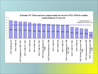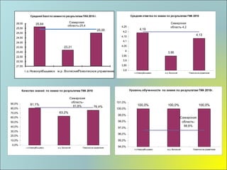 Документ содержит итоги государственной аттестации по химии среди выпускников 9-х классов Поволжского округа в 2010 году, включая количество участников и качество знаний. Результаты показывают высокие достижения некоторых школ, с максимальными баллами, достигнутыми учениками гимназий и сош. Также представлены данные о выполнении заданий экзаменационного тестирования по различным темам химии с процентами успешности по отдельным заданиям.