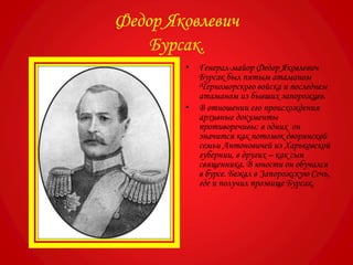 Генерал-майор Федор Яковлевич Бурсак был пятым и последним атаманом черноморского войска из запорожцев, чья биография содержит противоречивые данные о его происхождении. Он начал службу рядовым казаком в 1764 году, отличился в русско-турецкой войне и был назначен атаманом в 1799 году, занимая эту должность до 1816 года. Во время его управления в Екатеринодаре было построено несколько важных объектов, включая войсковой собор.