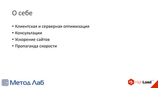 Документ описывает автоматизацию тестирования клиентской производительности, акцентируя внимание на важности выявления проблем до релиза кода и необходимости использования специализированных инструментов, таких как WebPageTest. Он делится практическими примерами применения автоматизации, такими как оптимизация времени загрузки и рендеринга, а также обсуждает типичные проблемы и их решения. Также представлены различные метрики для оценки производительности веб-сайтов и рекомендации по их использованию.