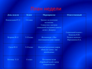 С 7 по 11 ноября 2016 года в рамках городской недели профилактики экстремизма в подростковой среде прошли различные мероприятия, направленные на воспитание единства и толерантности. Среди них тренинги на сплочение, фотоконкурс, флешмоб и посещение еврейского музея, все из которых способствовали уважению к многонациональной культуре России. Проект 'Диалог культур', реализованный при поддержке московской городской думы, стал важным шагом в содействии межконфессиональному согласию среди молодежи.