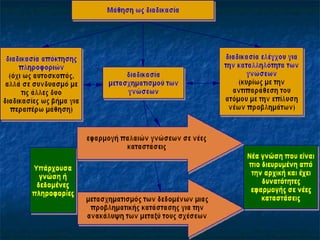 Μάθηση Μάθηση είναι η διαδικασία που υποβοηθεί τους οργανισμούς να τροποποιήσουν τη συμπεριφορά τους μέσα σε σχετικά σύντομο χρονικό διάστημα και με μόνιμο τρόπο, ώστε η ίδια τροποποίηση να μη χρειαστεί να επαναληφθεί σε κάθε νέα ανάλογη περίπτωση. ( Gagne: Essential of Learning for Instruction, 1975) Έλενα Ελληνιάδου