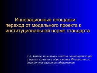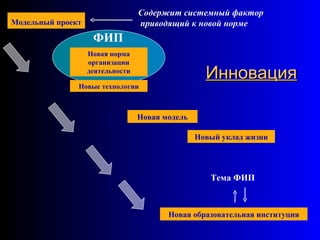 Документ описывает процесс перехода от модельных проектов к институциональной норме в сфере образования, включая различные этапы управления проектом, такие как инициация, планирование, исполнение и завершение. Он акцентирует внимание на важности проектной деятельности и разработки новых образовательных стандартов, а также содержит методики оценки качества образования. Включает примеры модельных проектов и оценочные шкалы для определения уровня их поддержки.