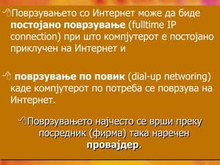 Поврзувањето со Интернетможе да биде постојано поврзување (fulltime IP connection) при што компјутерот е постојано приклучен на Интернет иповрзување по повик (dial-up networing) каде компјутерот по потреба се поврзува на Интернет. Поврзувањетонајчестосевршипрекупосредник (фирма)таканареченпровајдер. Да се потсетимеВеб прелистувач е програма која овозможува да се пристапи кон веб страниците