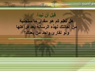 يتناول المستند وصفًا شاملاً لرسول الله صلى الله عليه وسلم، حيث يتضمن تفاصيل دقيقة عن صفاته الجسدية وما يميز شخصيته، مع إشارات الى فضائل الصلاة عليه وفضائل قراءة هذه الرسالة. يوضح أيضًا كيف يمكن لهذه الرسالة أن تجلب الحسنات لمن يساهم في نشرها. يُبرز النص أهمية ذكر النبي صلى الله عليه وسلم ويشجع على تعزيز المعرفة حوله.