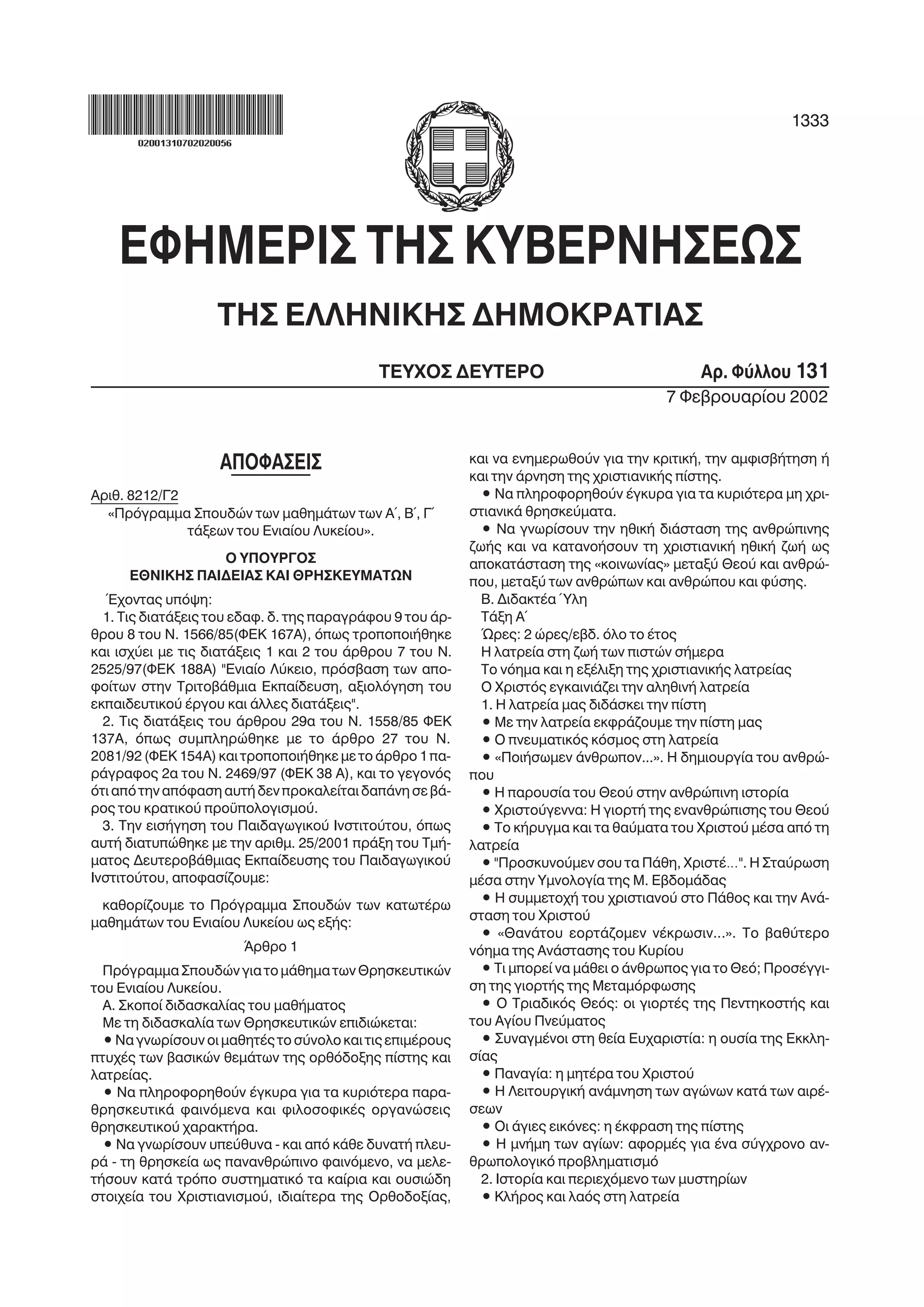 ΦΕΚ 131/τβ'/07-02-2002 http://www.socialstudies.edu.gr/