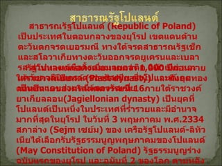 ( เป็นภาษาในตระกูลสลาฟ ) เมืองสำคัญ วู๊ด ( Lodz) ประชากร 825,600 คน ( เมืองอุตสาหกรรมทอผ้า ) คราคูฟ ( Krakow) ประชากร 746,000 คน ( เมืองหลวงเก่า ) กดั๊งซ์ ( Gdansk) ประชากร 463,000 คน ( เมืองท่าสำคัญและอู่ต่อเรือ ) วันชาติ 3 พฤษภาคม ( Constitution Day)