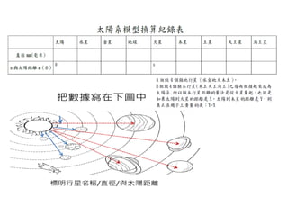 太陽系尺度換算 1線上軟體--- http://www.exploratorium.edu/ronh/solar_system/ 2換算方式: (1)在太陽處輸入數字(如10mm) 表示將太陽縮小到此尺度 (2)按下“calculate”(計算) , 系統即會以此比例進行計算 (3) 體直徑(mm): 各行星在此尺度下的相對直徑(mm) (4)規模化的軌道半徑(m): 各行星與太陽的(平均)距離 (5)試演算三個不同尺寸的模型,並記錄結果