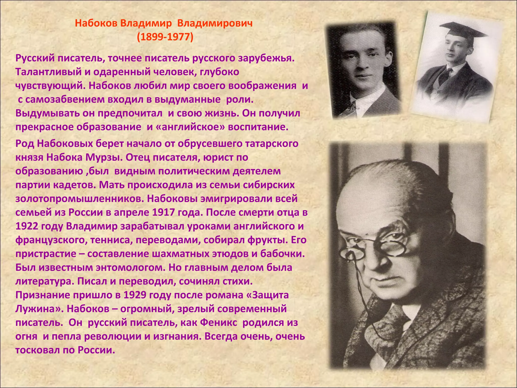 Владимир Набоков, русский писатель, известный своей богатой жизнью и литературной деятельностью, эмигрировал из России после революции 1917 года. В рассказе 'Бритва' главный герой Иванов, парикмахер, столкнулся с человеком из своего прошлого, который когда-то приговорил его к расстрелу, и с помощью своей бритвы он решает отомстить, но в итоге прощает своего врага. Тематика мести и справедливости поднимает вопросы о моральном выборе и ценности жизни.