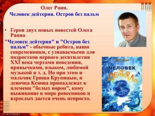 Документ содержит обзор двух повестей Олега Раина, 'Человек дейтерия' и 'Остров без пальм', в которых главные герои, подростки Гриша и Ксюша, сталкиваются с трудностями принятия в обществе и семейными проблемами. Гриша находит друга, который помогает ему обрести уверенность, а Ксюша борется за воссоединение с братом, показывая важность дружбы в трудные времена. Основная тема произведений заключается в том, что настоящие друзья могут помочь преодолевать любые преграды.