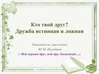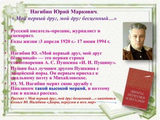 Рассказ Юрия Нагомина "Мой первый друг, мой друг бесценный..." исследует тему дружбы через воспоминания главного героя о двух друзьях, один из которых был мнимым, а другой - настоящим другом, павликом. Павлик отличается самостоятельностью, честью и внутренним мужеством, что вызывает уважение у героя. Сюжет завершается трагической потерей павлика во время войны, что оставляет герою чувство вины и грусть.