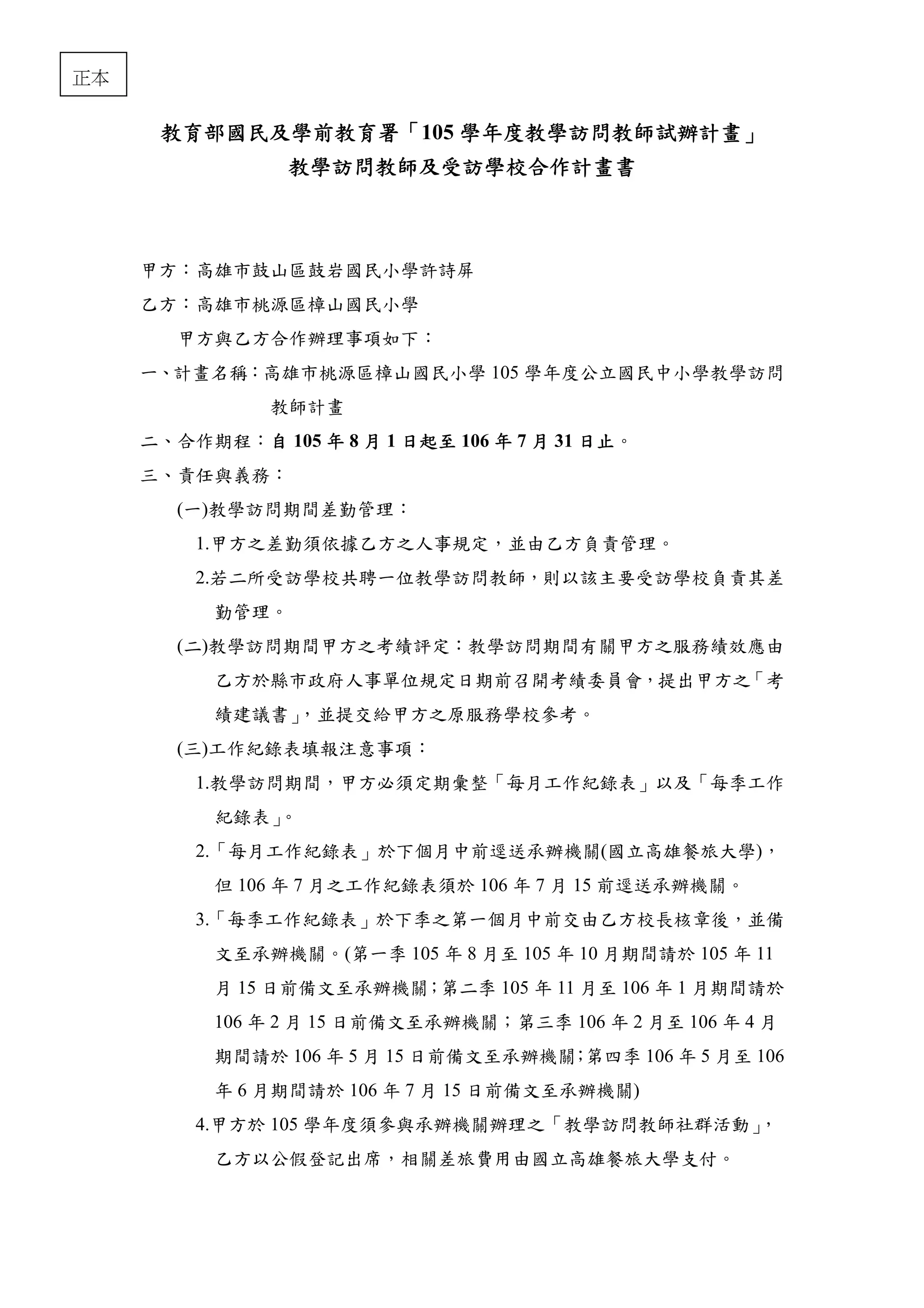 文档介绍了高雄市州山国民小学和鼓岩国小之间的教學訪問教师合作计划,计划期间为105年8月1日至106年7月31日。主要目的是引进具有数学专长的教师以提升偏乡学生的数学学习成绩,并包括多项责任与义务,如考绩评定和工作记录提交等。计划还强调合作方需遵守工作内容,并通过专业学习社群进行系统性的教学交流。